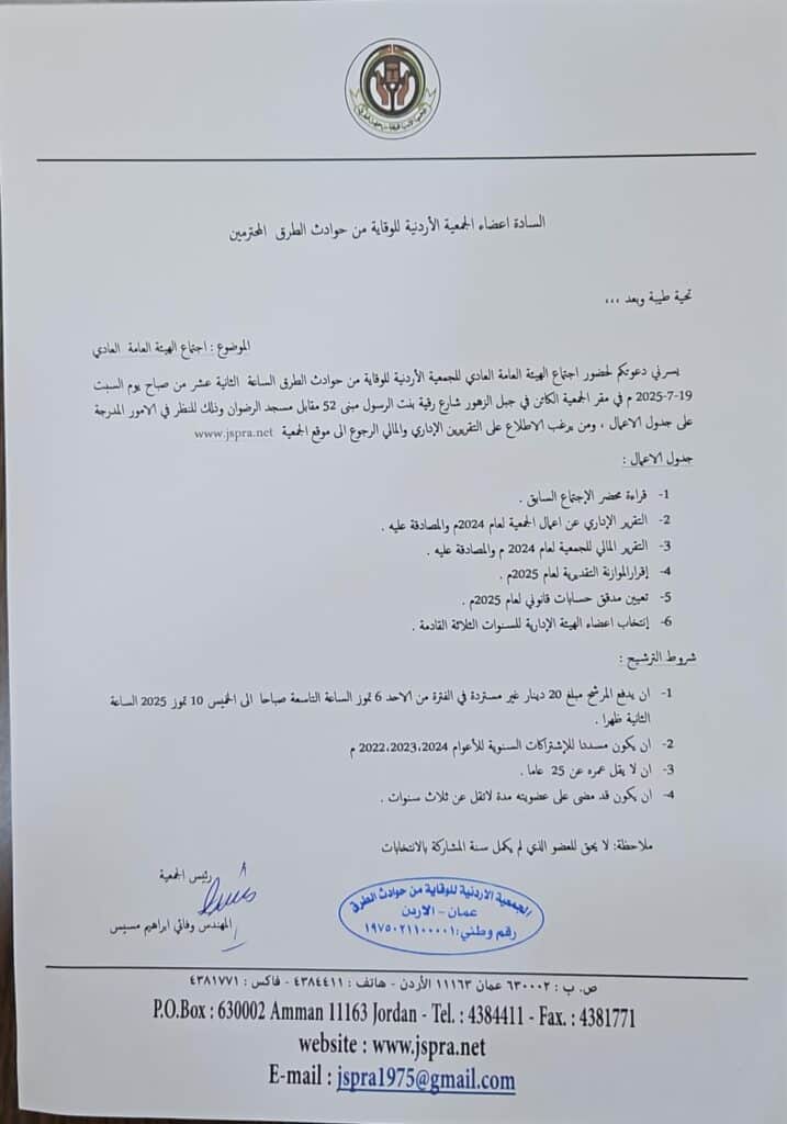 بتاريخ ٢٣ كانون اول تم توقيع مذكرة تفاهم بين الجمعية الأردنية للوقاية من حوادث الطرق و نادي السيارات الملكي في مقر الجمعية و ذلك تعزيزا للسلامة المرورية و نشر الوعي حول أهمية القيادة الآمنة على الطرق